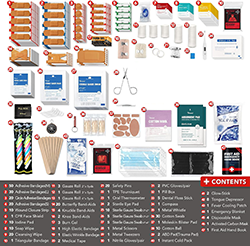 종합 구성품:상처 관리: 붕대, 거즈 패드, 접착 테이프, 소독 물티슈