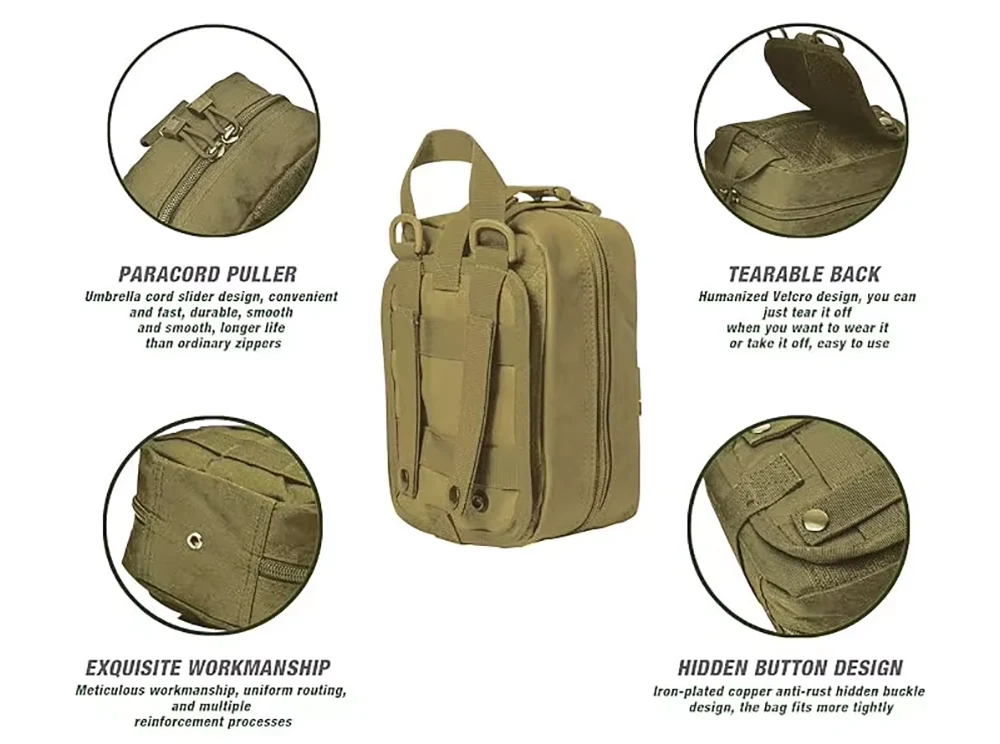 고급 견고한 폴리 에스테르 재료와 튼튼한 이중 스티칭은 모든 환경 에서이 전술 의료용 파우치 내구성을 제공합니다. 강한 스냅이있는 Molle 스트랩을 사용하면이 의료용 파우치를 Molle 호환 장비에 부착 할 수 있습니다. 클래식 디자인 로우 프로파일 파우치. 의료용 파우치